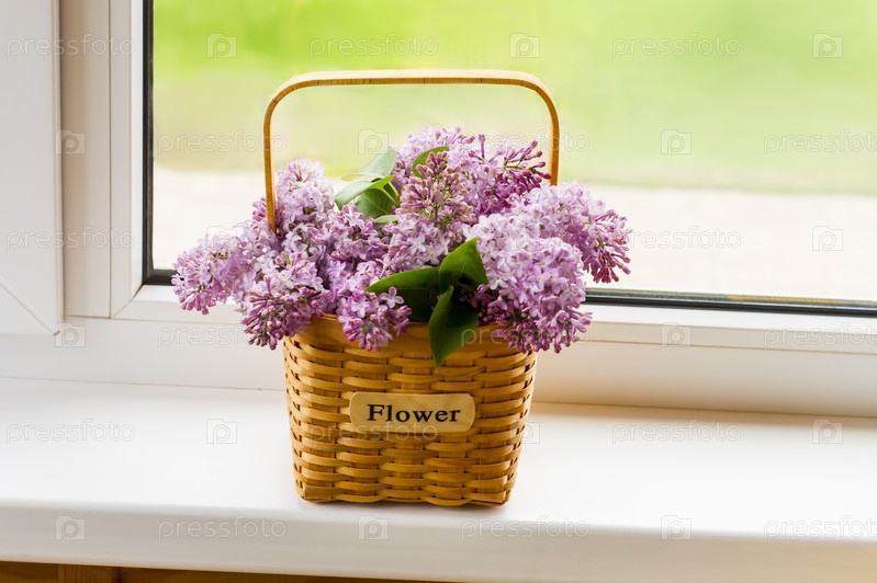Декоративная цветочная корзина с ветками весенней сирени на подоконнике загородного дома. концепция хорошего весеннего настроения