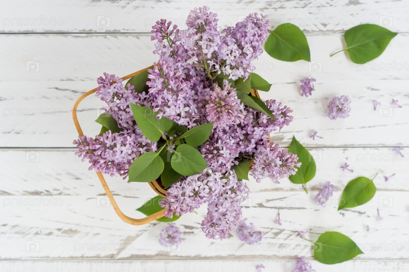 Вид сверху на весенний букет фиолетовой сирени в цветочной корзине на белом деревянном фоне. весенняя композиция для создания хорошего настроения
