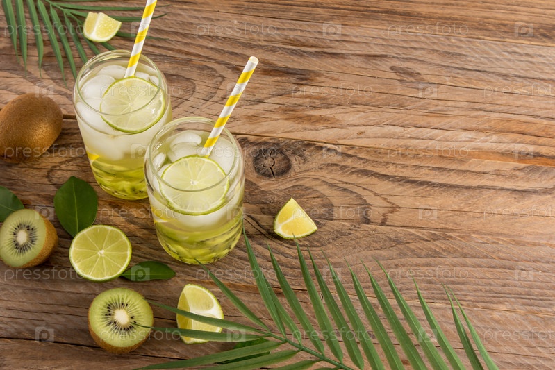 Витаминная вода с киви и лаймом в современных стаканах в виде пивной банки на фоне деревянного стола, фруктов и тропических листьев