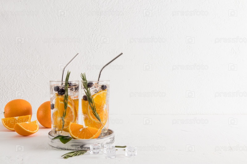 Два стакана настоянной воды с апельсином и черникой, веточки розмарина на белом столе напротив белой кирпичной стены и спелые фрукты. копировать пространство