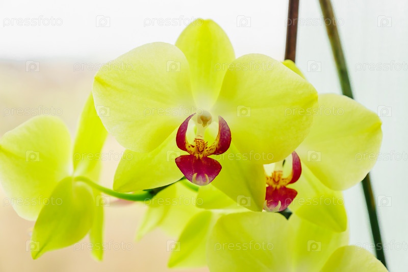 Желтые экзотические цветы орхидеи на подоконнике. Домашнее садоводство