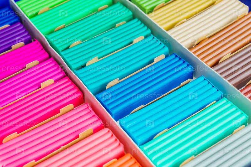 Цвета радуги из пластилина. Разноцветные пластилиновые батончики в коробке, фоновая текстура