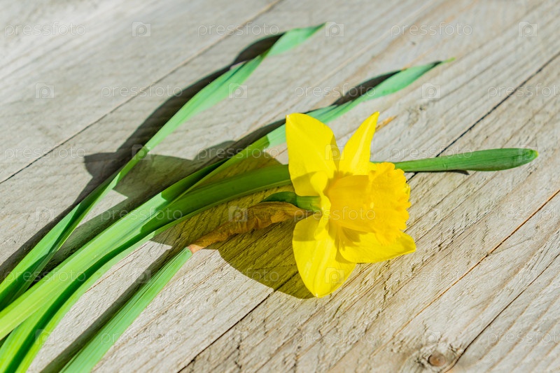 Крупный план желтого цветущего цветка нарцисса на деревянном фоне
