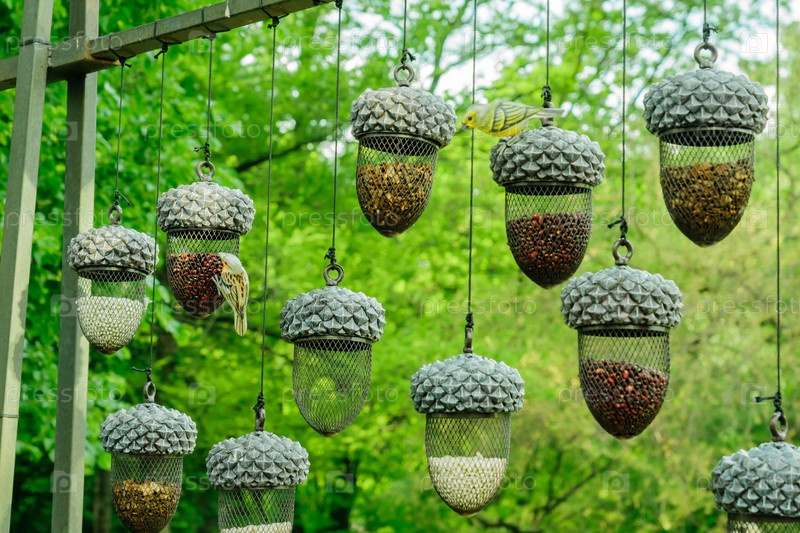 Планти подвесных кормушек для птиц в форме желудя, полного разного зерна на фоне леса