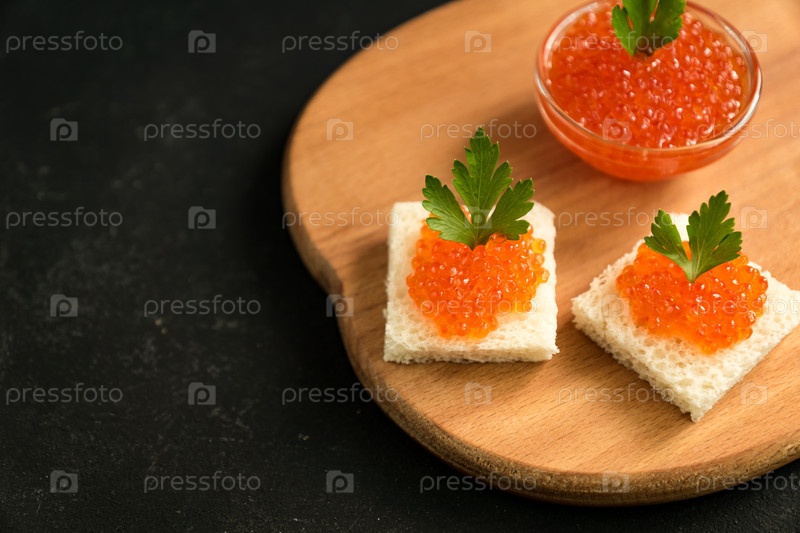 Вкусная красная икра на пшеничном хлебе с петрушкой на деревянном столе. Скопируйте место для вашего текста