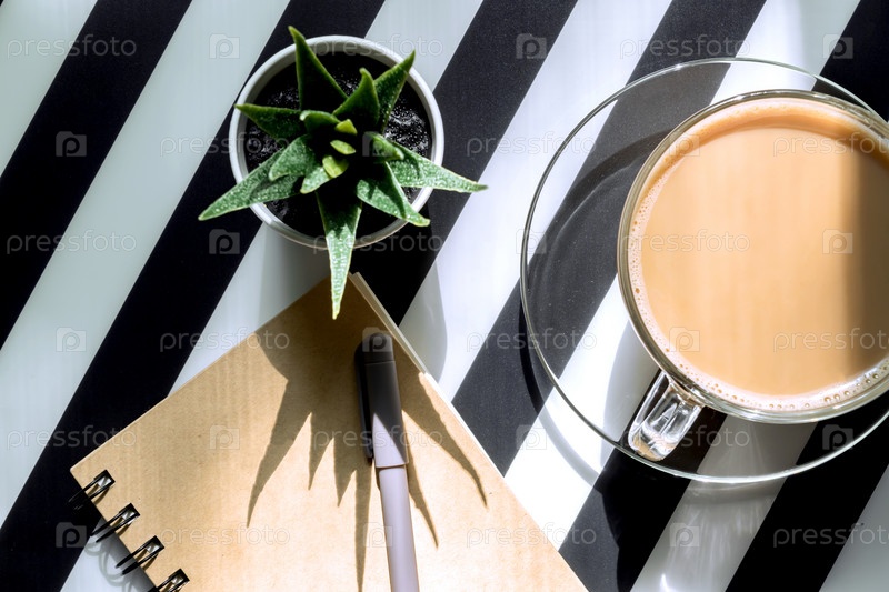 Стильное минималистичное рабочее пространство с блокнотом, ручкой, чашкой кофе и сочными на полосатом черно-белом фоне. Плоский вид сверху