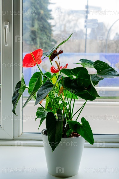 Розовый цветущий цветок антуриума на подоконнике. домашнее садоводство. Домашнее растение