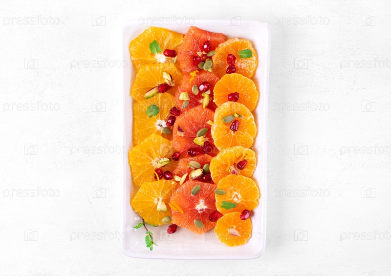 Цитрусовый салат с дольками апельсина, красного апельсина, мандарина, тыквенными семечками, фисташками и гранатом на керамической прямоугольной тарелке на белом столе. Здоровая веганская еда