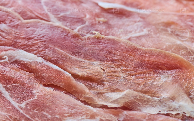 Сырая вялая итальянская ветчина Прошутто крупным планом, малая глубина резкости