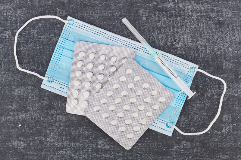 Таблетки, медицинская маска, шприц на сером фоне, вид сверху. Первая помощь, уход во время болезни
