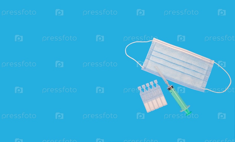 Концепция вакцинации, на голубом фоне лежит медицинская маска, шприц и ампулы с вакциной, вид сверху, место для текста