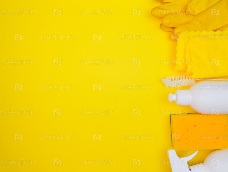 Чистящие средства желтого цвета по правому краю, перчатки, тряпка, губка, моющие средства, вид сверху, пространство для текста, желтый фон