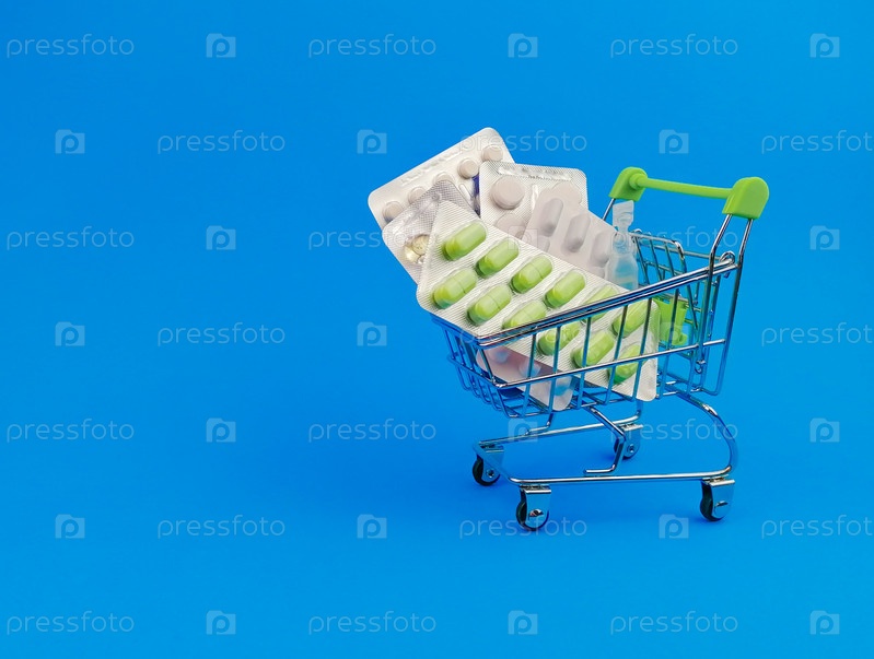Корзина с таблетками на синем фоне. Концепция медицины и продажи лекарств. Место для текста