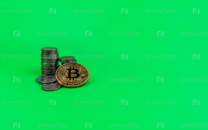 Биткойн лежит на горсти монет на зеленом фоне. Криптовалюта