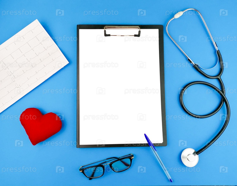 Стол врача со стетоскопом, кардиограммой, термометром, медицинской маской и красным сердцем, вид сверху, место для текста