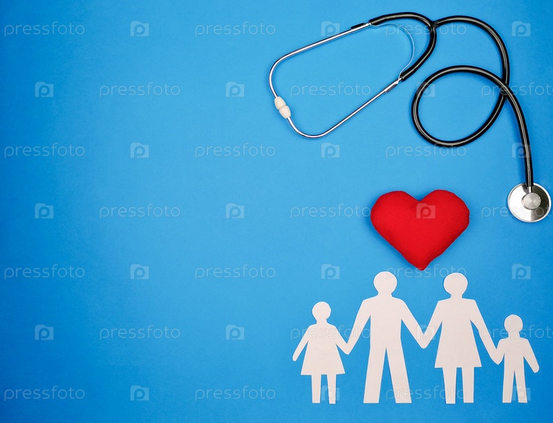 Фонендоскоп, красное сердце и белые бумажные фигурки семьи на цветном фоне. Медицинский инструмент на синем фоне. Концепция семейной медицины. Вид сверху