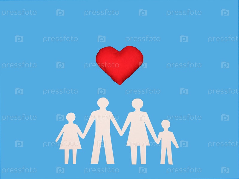Концепция счастливой семьи, на синем фоне, белые фигурки семьи из бумаги и красное сердце над ними, вид сверху