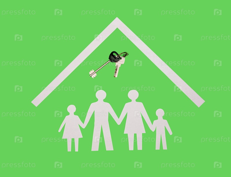 Концепция ипотеки, на зеленом фоне лежат белые фигурки семьи из бумаги под крышей и ключи от дома, вид сверху
