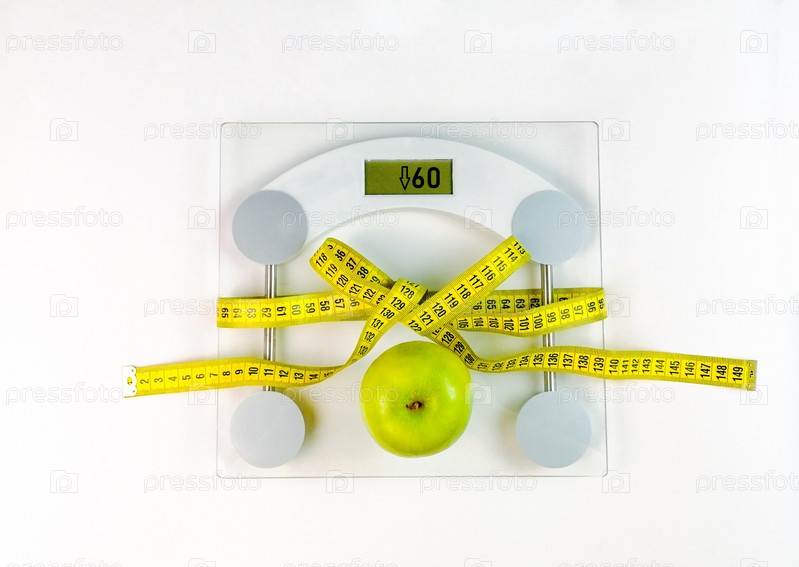 Весы, перевязанные сантиметровой лентой, на весах лежит зеленое яблоко, на белом фоне, похудение, диета