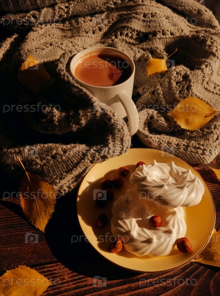 Кружка с какао, завернутая в вязаное одеяло, и тарелка с безе и орехами стоят на темных деревянных досках, а вокруг разбросаны желтые осенние листья, в желтом закатном свете