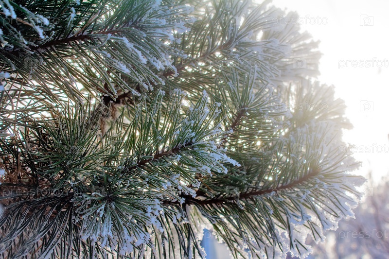 Сосновая ветвь с зелеными длинными иглами, покрытая белым снегом, на фоне деревьев