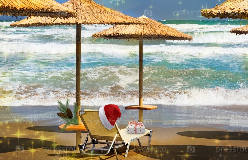Рождественский пляж: скамейка и шляпа Санты Клауса. 3D-рендеринг