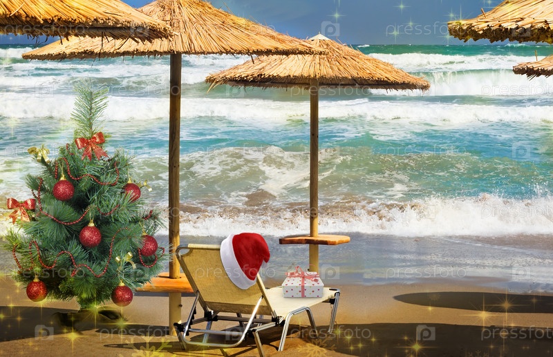 Рождественский пляж: на пляже на шезлонге лежит подарок, рядом с ним шляпа Санты и елка. 3D-рендеринг