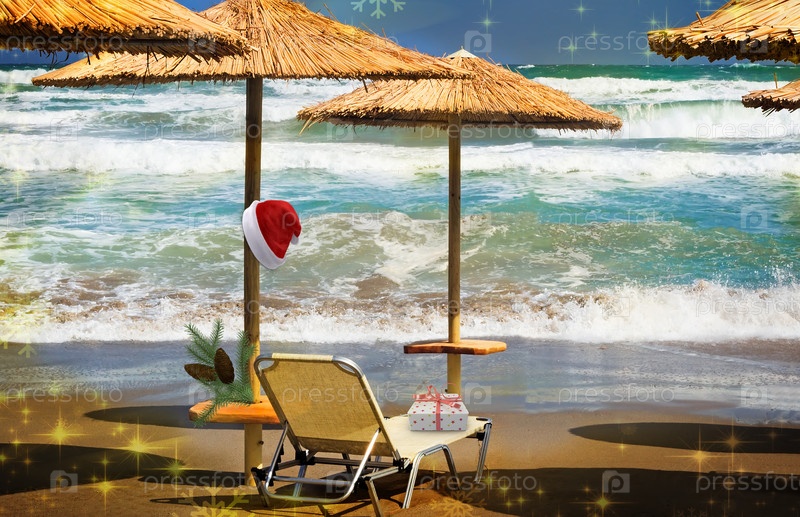 Рождественский пляж: на пляже на шезлонге лежит подарок, рядом с ним шляпа Санты и елка. 3D-рендеринг