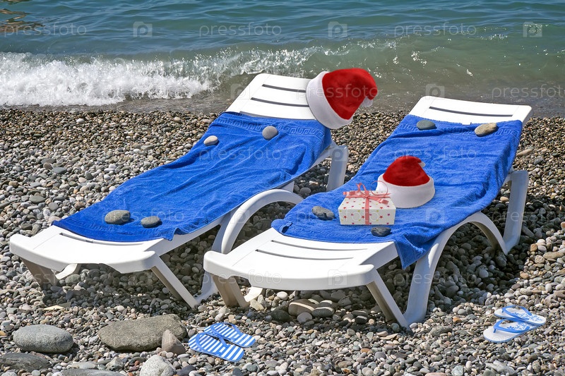 Рождественский пляж: шезлонг, елка и шляпа Санта-Клауса. 3D визуализация