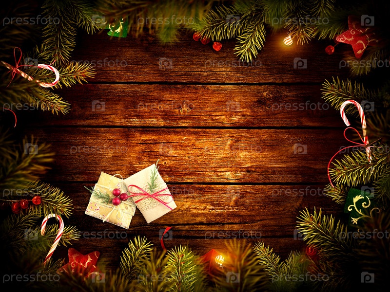 Символы Рождества: украшения, подарки, еловые ветки на деревянном фоне
