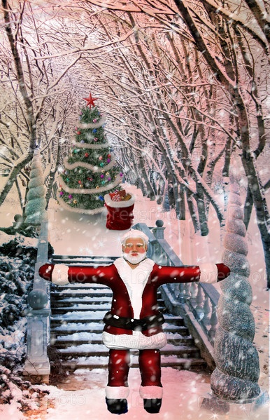 Рождественский пейзаж с Дедом Морозом и подарками. 3D-рендеринг