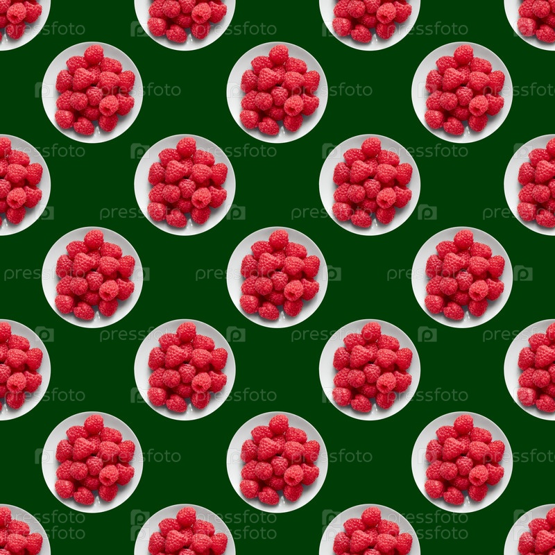 Красная малина на зеленом фоне. Вид сверху, малиновый узор