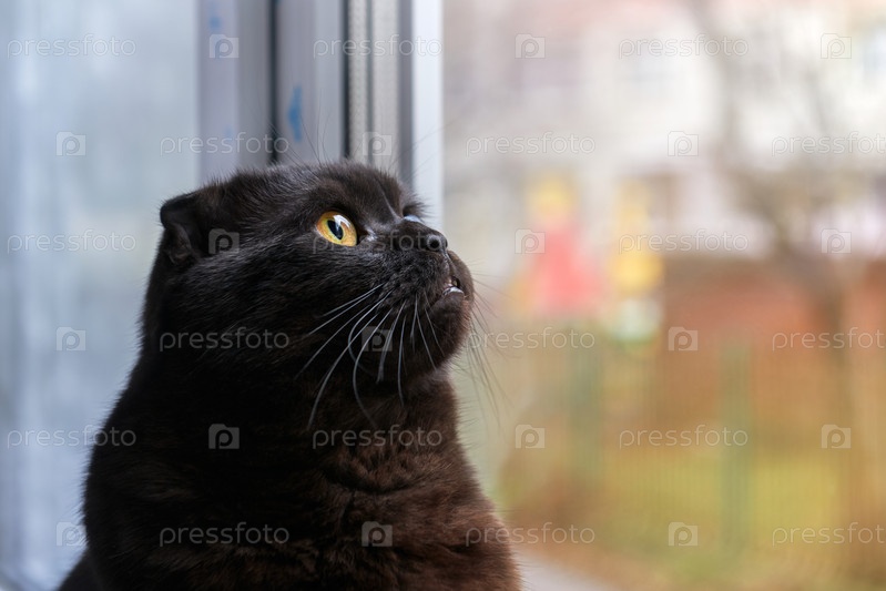 Симпатичная короткошерстная кошка сидит и смотрит в окно в пасмурный день