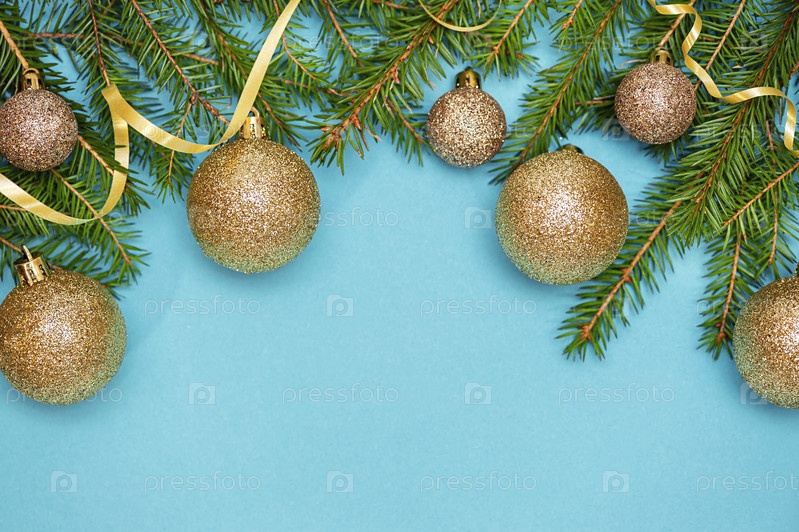 Рождественский фон с золотыми украшениями и зелеными сосновыми ветвями