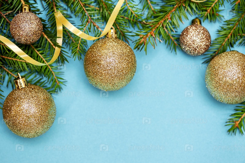 Рождественские золотые украшения и зеленые сосновые ветки на синем фоне. Место для текста