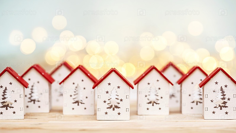 Маленькие рождественские домики на фоне расфокусированных огней. Концепция празднования Рождества и Нового года дома
