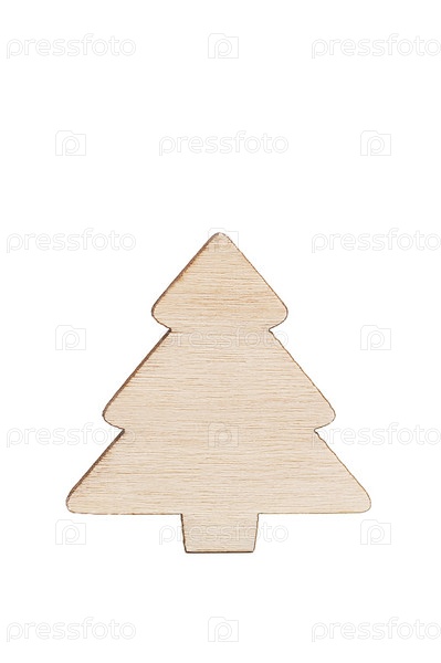 Маленькая деревянная ель на белом фоне, новогоднее украшение