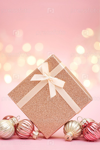 Подарочная коробка и рождественские украшения на розовом праздничном фоне. Вертикальное фото