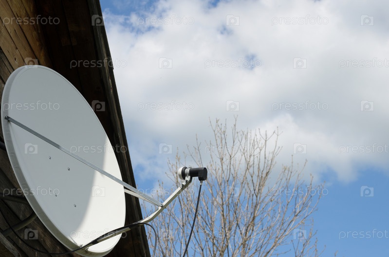 Спутниковая антенна на загородном доме на фоне голубого неба с облаками. Важность телекоммуникаций в период самоизоляции