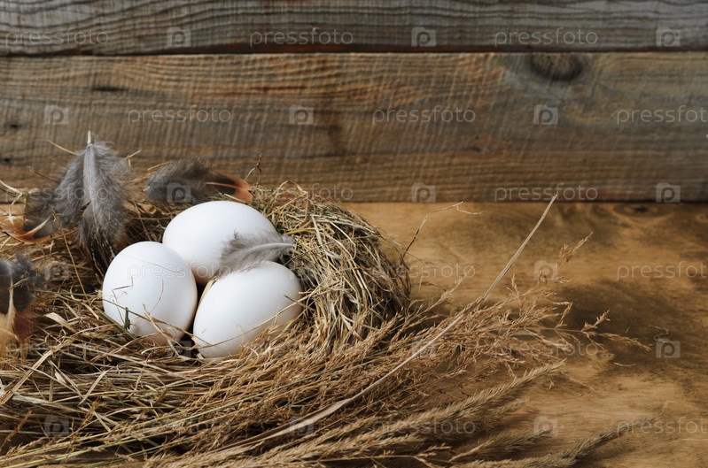 Куриные яйца с перьями в гнезде сена на деревянном фоне