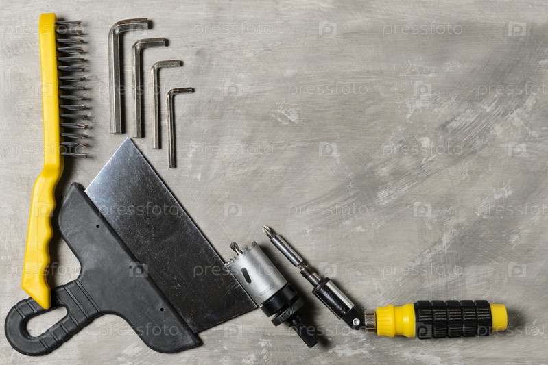 Старые инструменты разложены на шероховатой бетонной поверхности