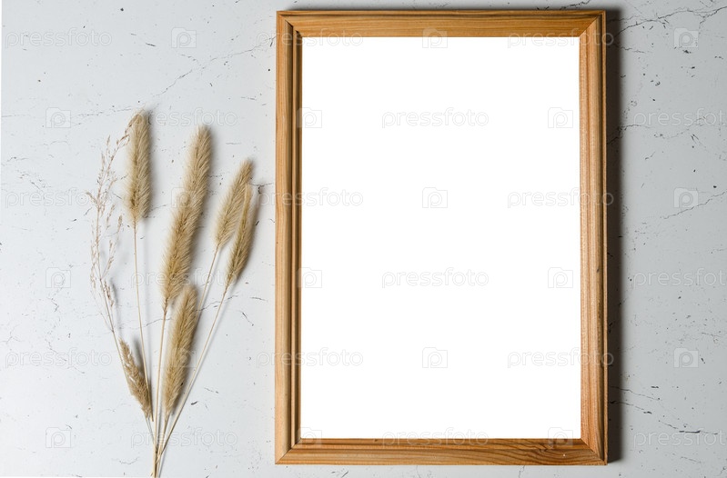 Деревянная фоторамка на фактурной стене со стеблями пушистой высушенной травы