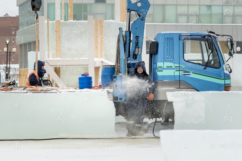 Рабочий-установщик со шлангом льет воду на лед