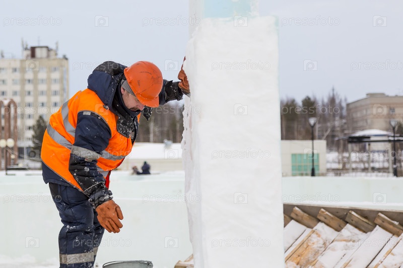 Рабочий покрывает стыки ледяных панелей мокрым снегом