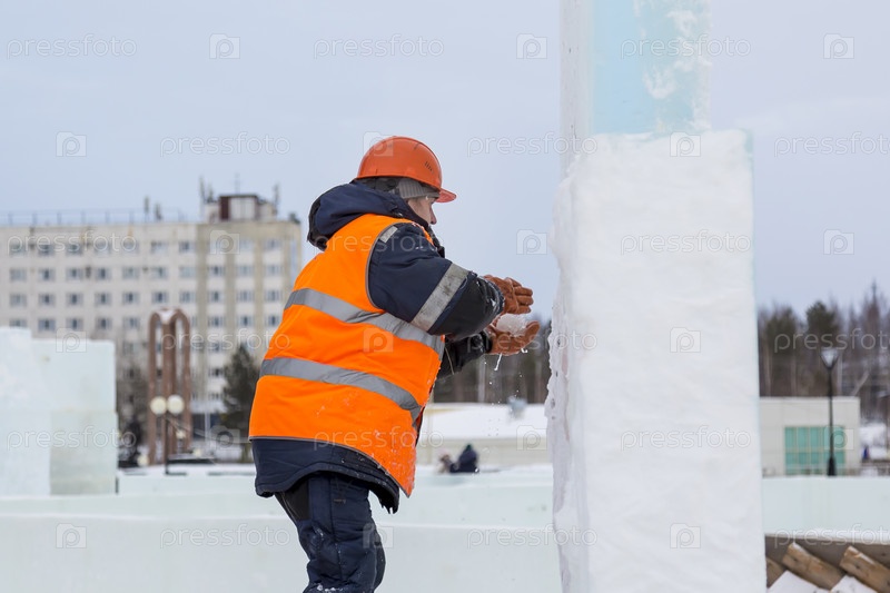 Рабочий покрывает стыки ледяных панелей мокрым снегом