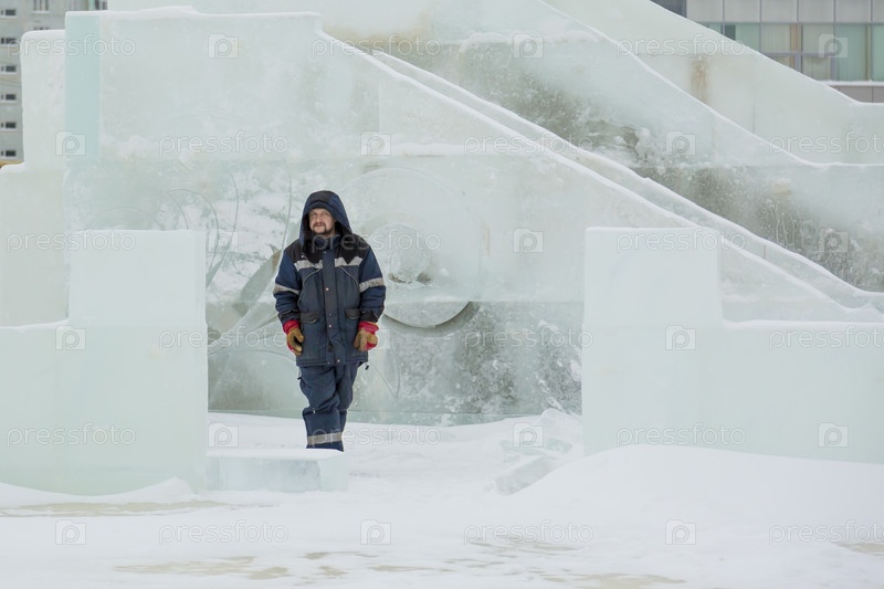Сборщик в комбинезоне на территории ледового городка