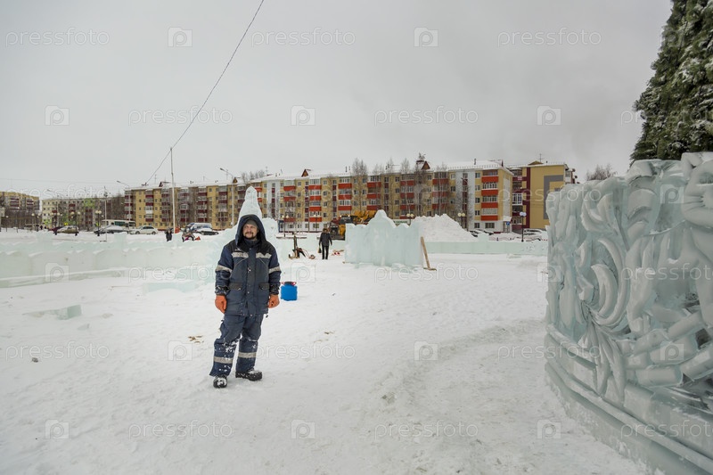 Сборщик в комбинезоне на территории ледового городка