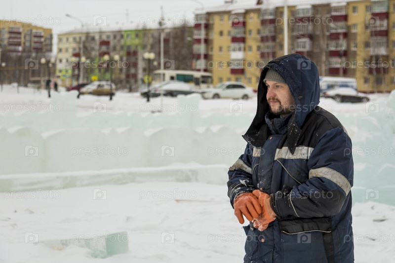 Сборщик в комбинезоне на территории ледового городка