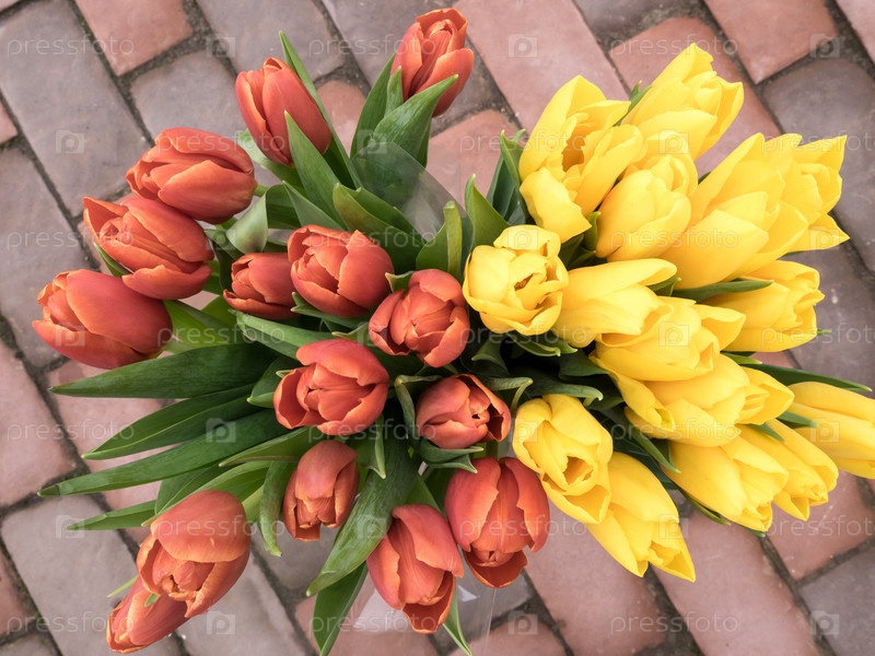 Праздничный букет желтых и красных тюльпанов, стоящих на тротуаре, вид сверху