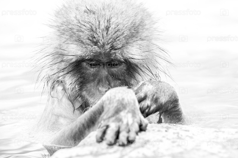 Черно-белый портрет снежной обезьяны (Macaca fuscata) из парка обезьян Джигокудани в Японии, префектура Нагано